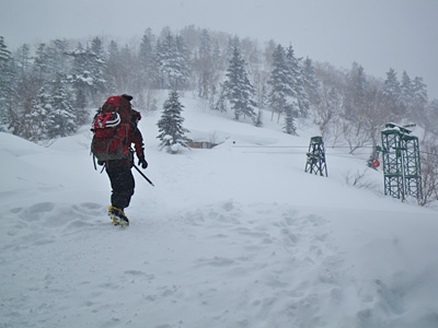 目印の赤旗はあるんですが、先行者のトレースは吹雪ですでに消えてしまっています。 こういった点でも、赤旗は安心です。