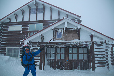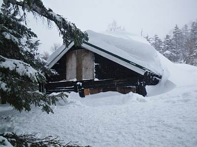 合戦小屋・・8月と9月はカレーうどんにスイカを食べたんですけど、冬季は小屋の下部は雪に埋もれています。 30日は気温が上がったから少し融けたのかもしれませんが、この辺りで結構な積雪量です!