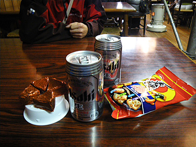 先客の方はすでに寝ているようでしたので、邪魔にならないように、つまみとかを持って1階へ下り、まずはビール…と、冬は缶ビールしかないので、350ml500円を売店で購入して乾杯です♪